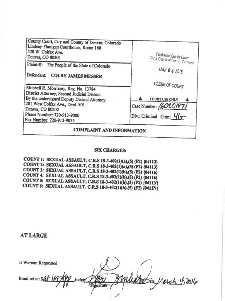‘of Colorado has this day filed a Complainv/information in this Court charging COLBY JAMES MESSER