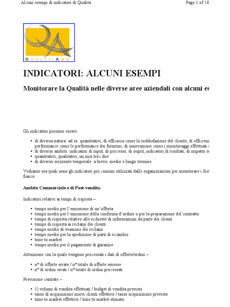 Alcuni esempi di indicatori di Qualità Page 1 of 10