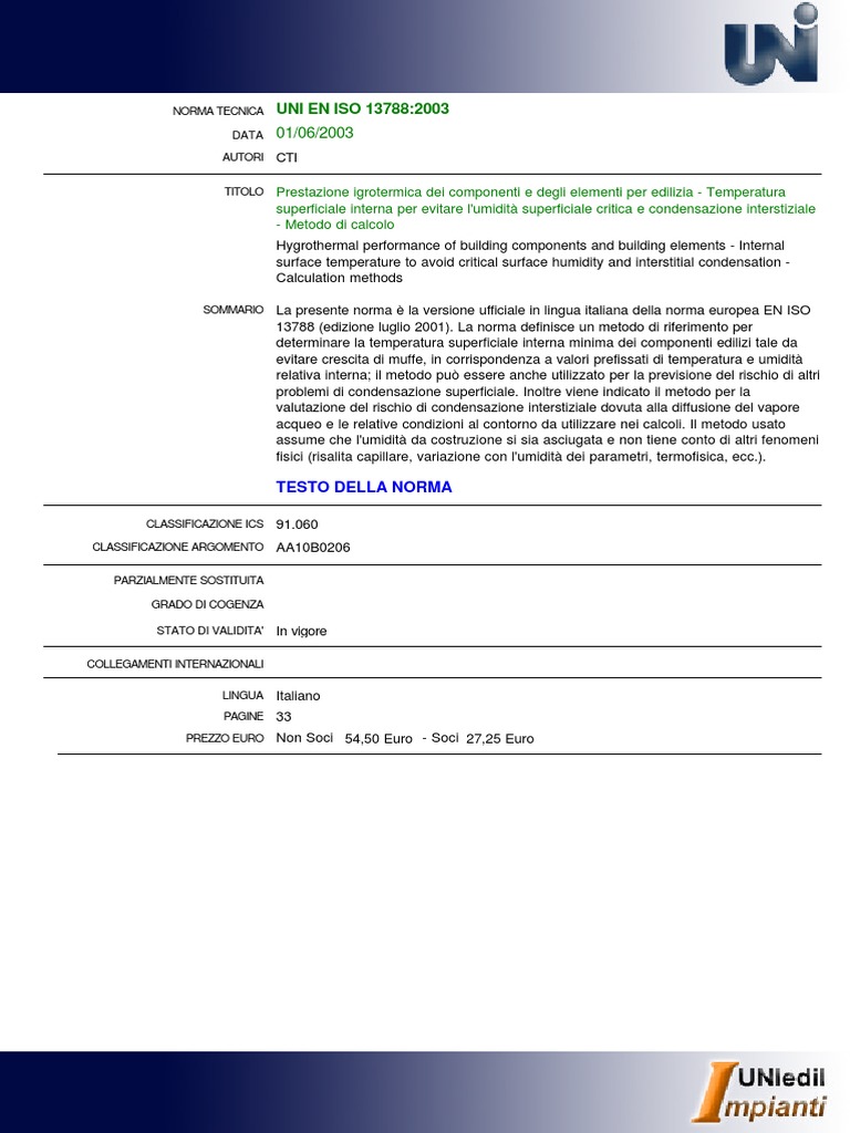 UNI EN ISO 13788:2003 - 01-06-2003 - Prestazione igrotermica dei componenti e degli elementi per edilizia - Temperatura superficiale interna per evitare l'umidit superficiale critica e condensazione interstiziale Metodo di calcolo