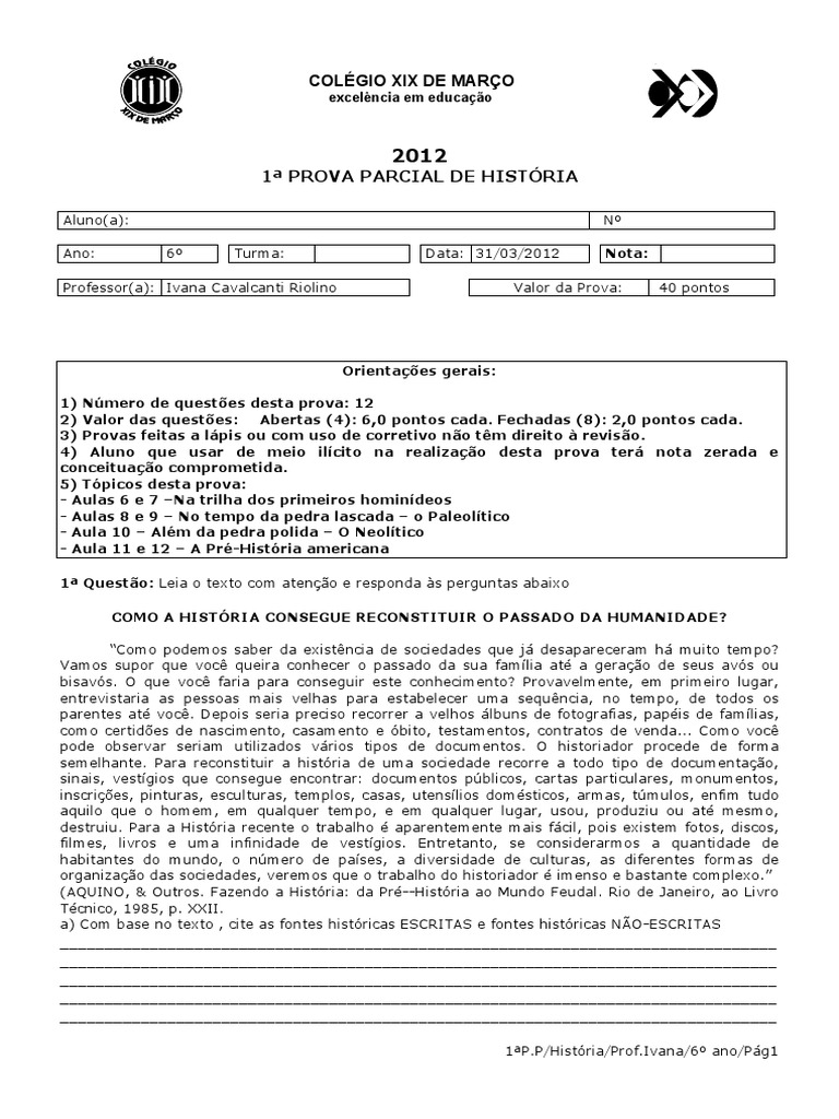 1 PROVA PARCIAL DE HISTRIA