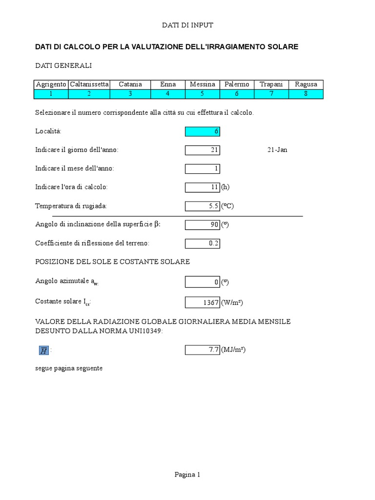 DATI DI CALCOLO PER LA VALUTAZIONE DELL'IRRAGIAMENTO SOLARE