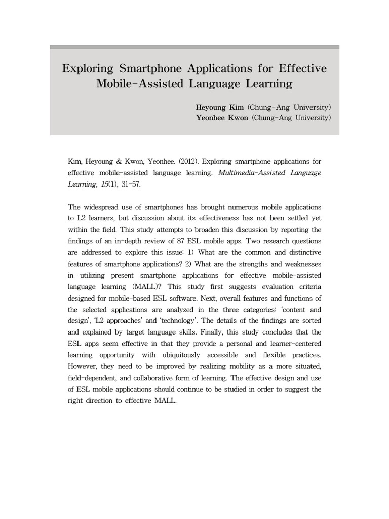 Since the term mobile-assisted language learning (MALL) was first coined by Chinnery (2006), the use of mobile devices to support language learning has increased exponentially. Although, in general, MALL has been considered as a subset of both mobile learning and computer-assisted language learning, Kukulska-Hulme and Shield (2008) note that MALL differs from CALL “in its use of personal, portable devices that enable new ways of learning, emphasizing continuity or spontaneity of access and interaction across