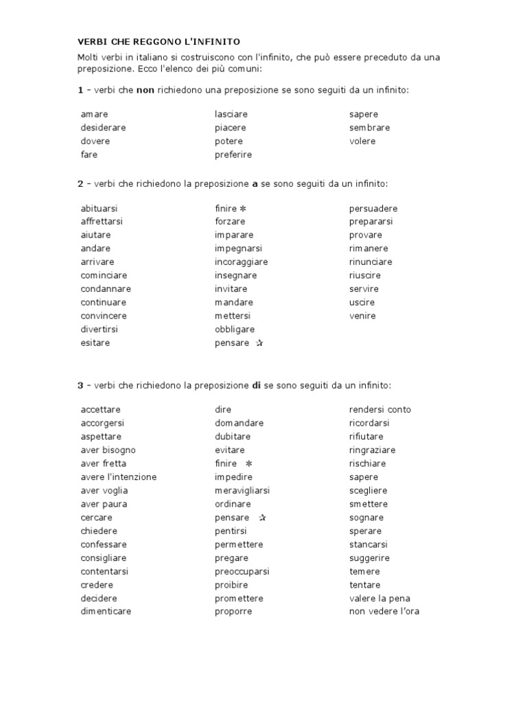 1 - verbi che non richiedono una preposizione se sono seguiti da un infinito: