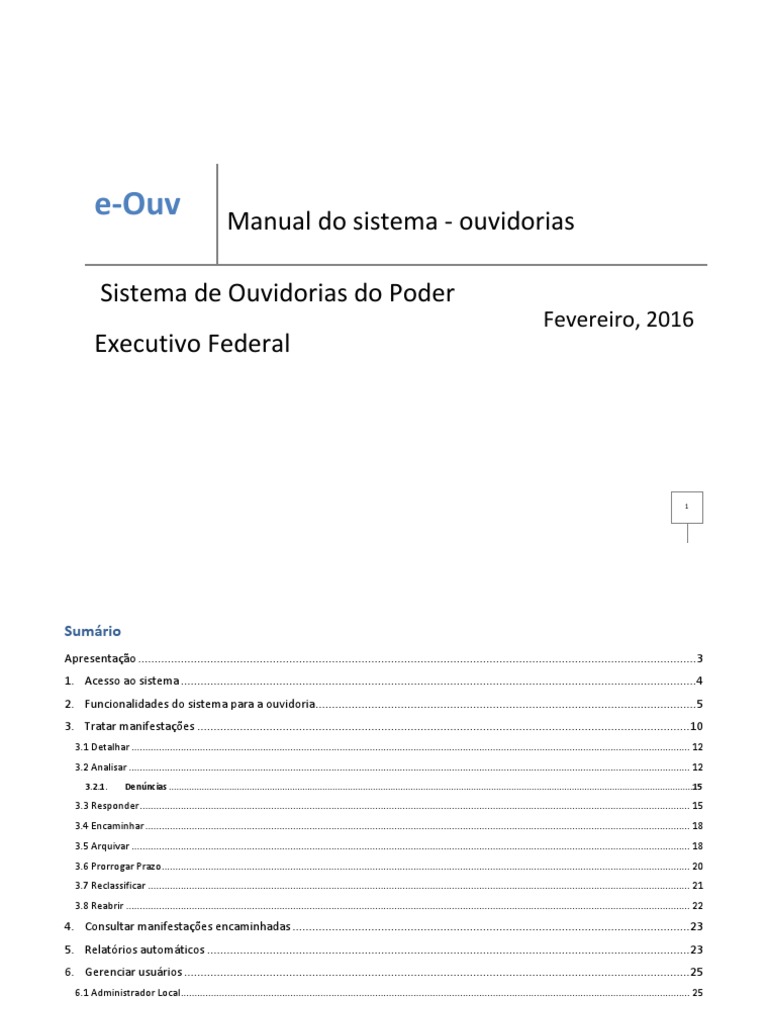 O Sistema de Ouvidorias do Poder Executivo Federal (e-Ouv) foi desenvolvido pela Controladoria-Geral da União e é utilizado por diversos órgãos e entidades para recebimento de manifestações. Este documento apresenta as principais funcionalidades do sistema para a ouvidoria. Traz as opções para a análise de uma manifestação e para a geração de relatórios automáticos. Detalhes sobre a gestão das manifestações e exemplos de boas práticas podem ser encontrados no Guia Prático de Tratamento de Manifestações no e-Ouv. Para auxiliar no uso do sistema, também existe uma lista de respostas às perguntas mais frequentes. Clique aqui e você será direcionado para o conteúdo no Ouvidorias.gov.