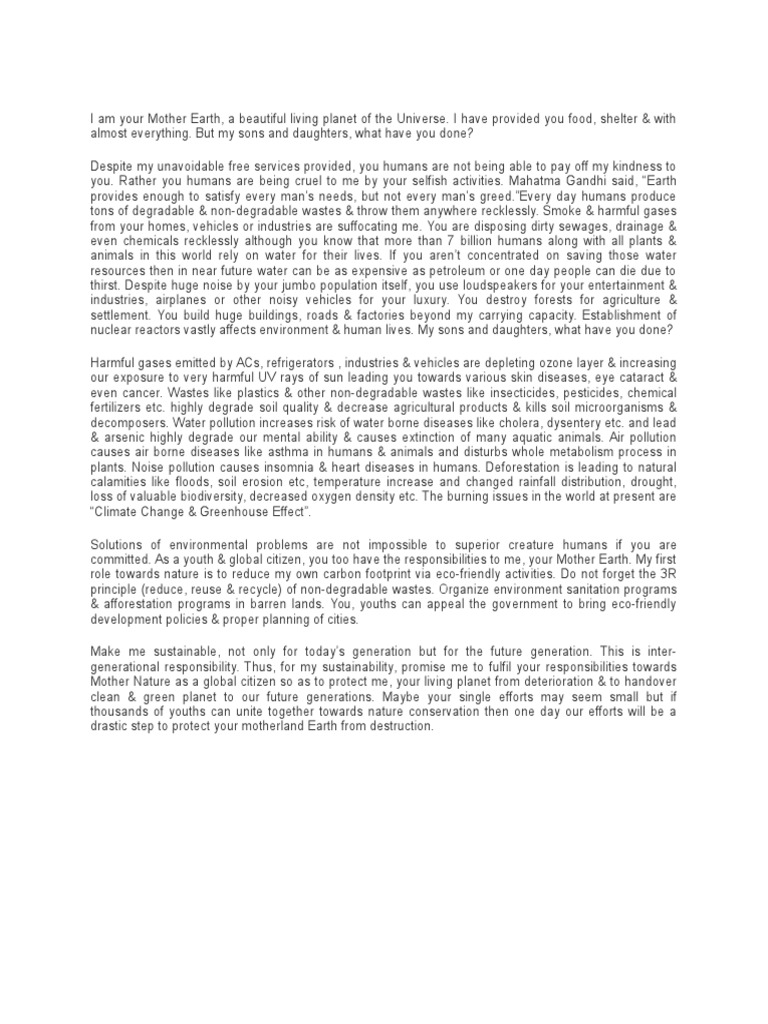 committed. As a youth & global citizen, you too have the responsibilities to me, your Mother Earth. My first