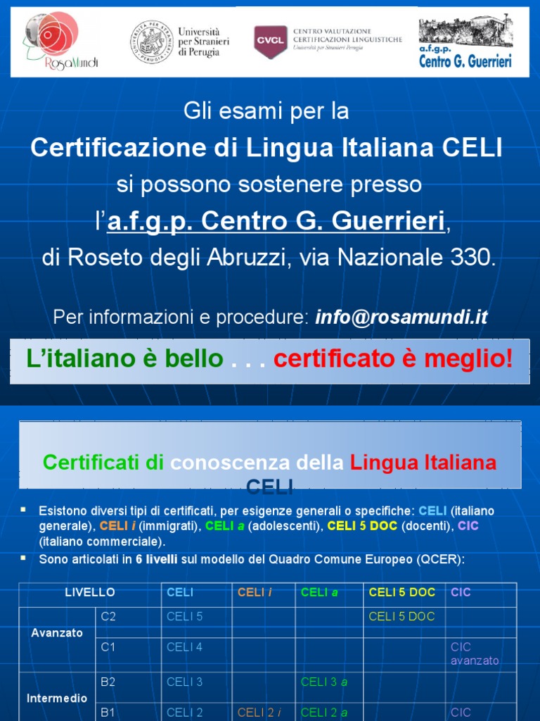 generale), CELI i (immigrati), CELI a (adolescenti), CELI 5 DOC (docenti), CIC