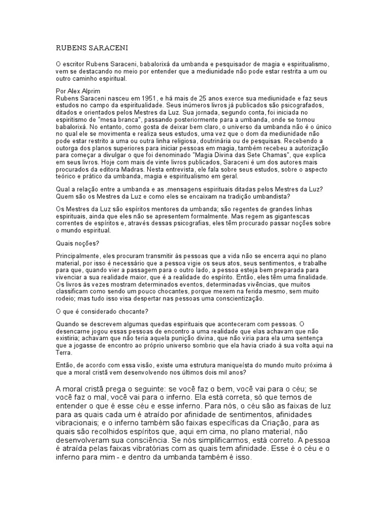 Rubens Saraceni nasceu em 1951, e h mais de 25 anos exerce sua mediunidade e faz seus