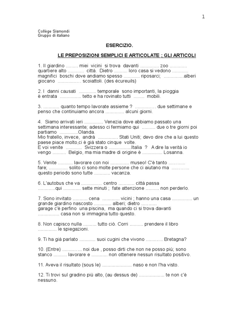 LE PREPOSIZIONI SEMPLICI E ARTICOLATE ; GLI ARTICOLI