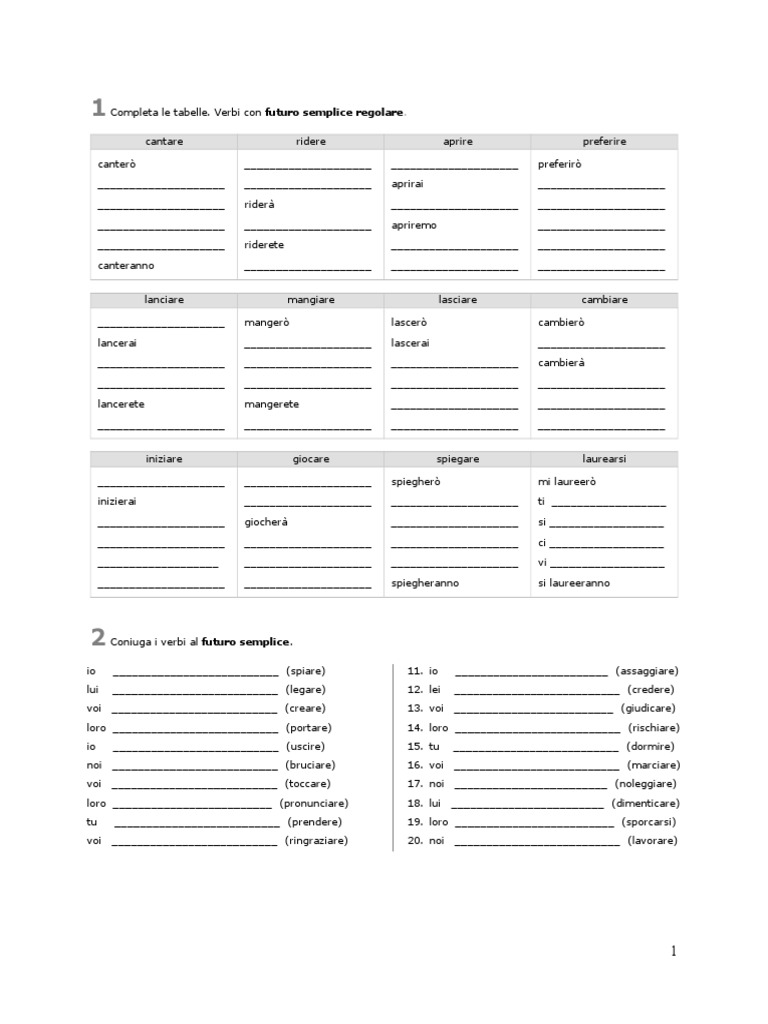 1 Completa le tabelle. Verbi con futuro semplice regolare.