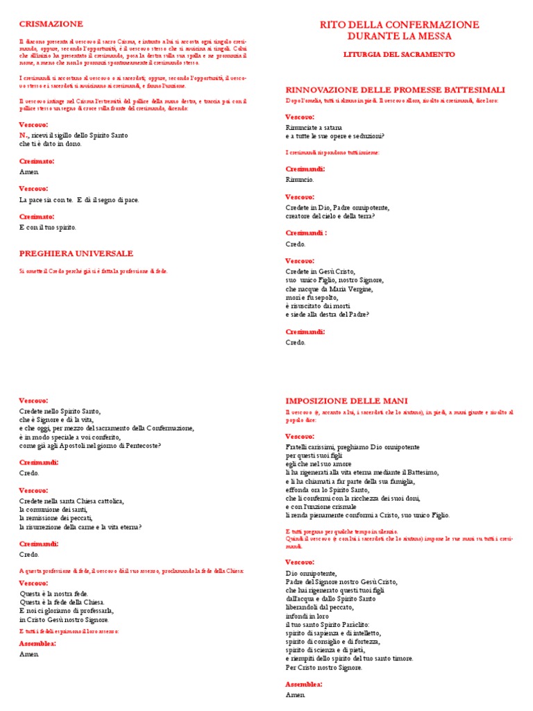 Il diacono presenta al vescovo il sacro Crisma, e intanto a lui si accosta ogni singolo cresimando, oppure, secondo l'opportunit, il vescovo stesso che si avvicina ai singoli. Colui