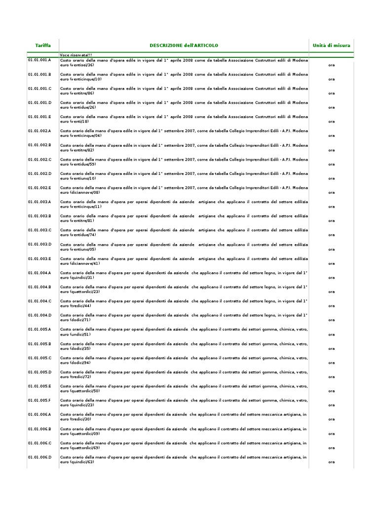 Costo orario della mano d'opera edile in vigore dal 1 settembre 2007, come da tabella Collegio Imprenditori Edili - A.P.I. Modena