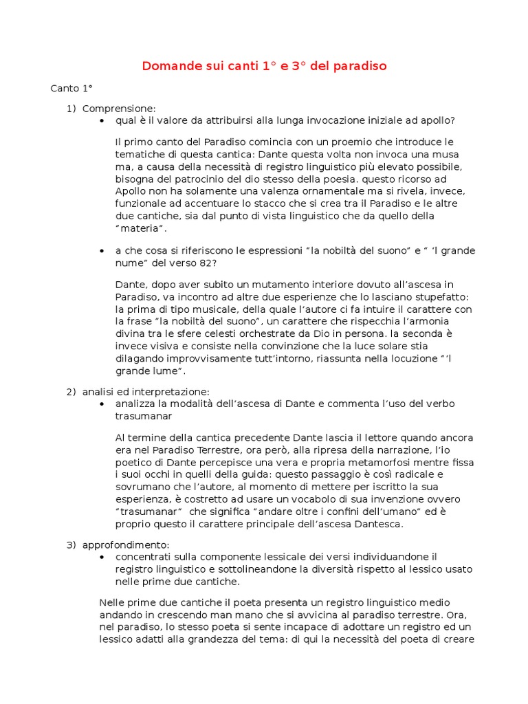 Domande sui canti 1 e 3 del paradiso