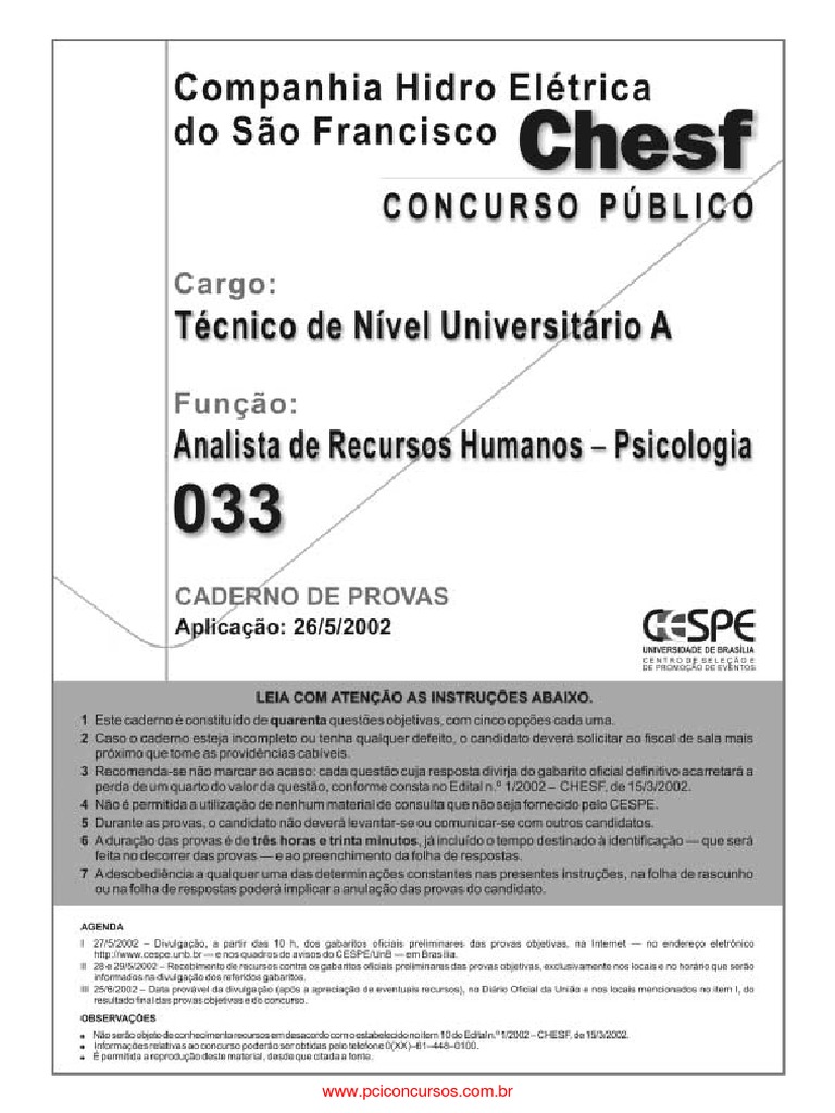 Cargo: Técnico de Nível Universitário A / Função: Analista de Recursos Humanos – Psicologia – 10 / 12