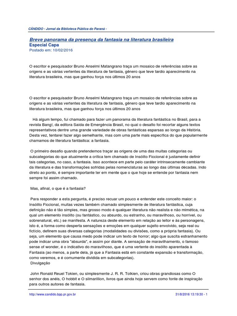 H algum tempo, fui chamado para fazer um panorama da literatura fantstica no Brasil, para a