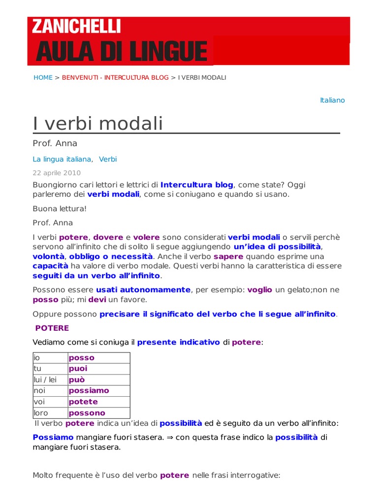 Il verbo potere indica unidea di possibilit ed seguito da un verbo allinnito:
