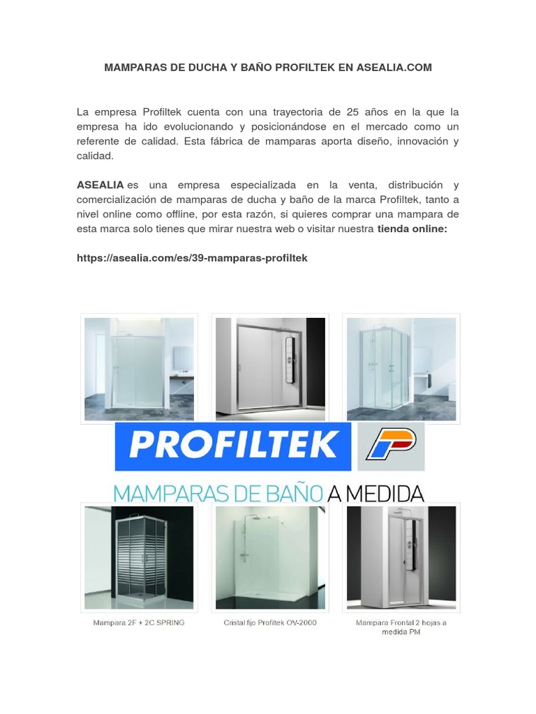 comercializacin de mamparas de ducha y bao de la marca Profiltek, tanto a