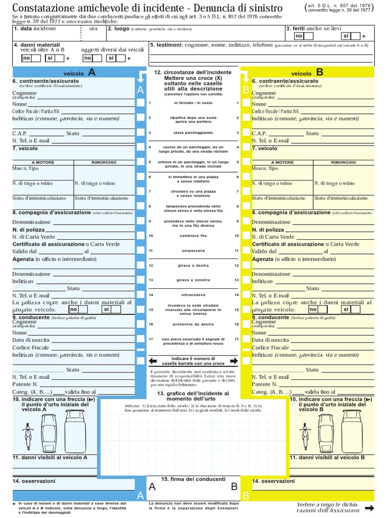 4. danni materiali 5. testimoni: cognome, nome, indirizzo, telefono (precisare se si tratta di trasportati sul veicolo A o B)