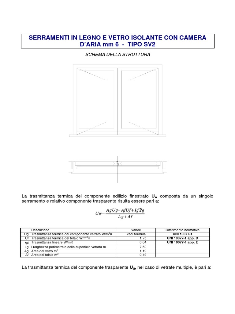 Ug Trasmittanza termica del componente vetrato W/m K vedi formula UNI 10077-1
