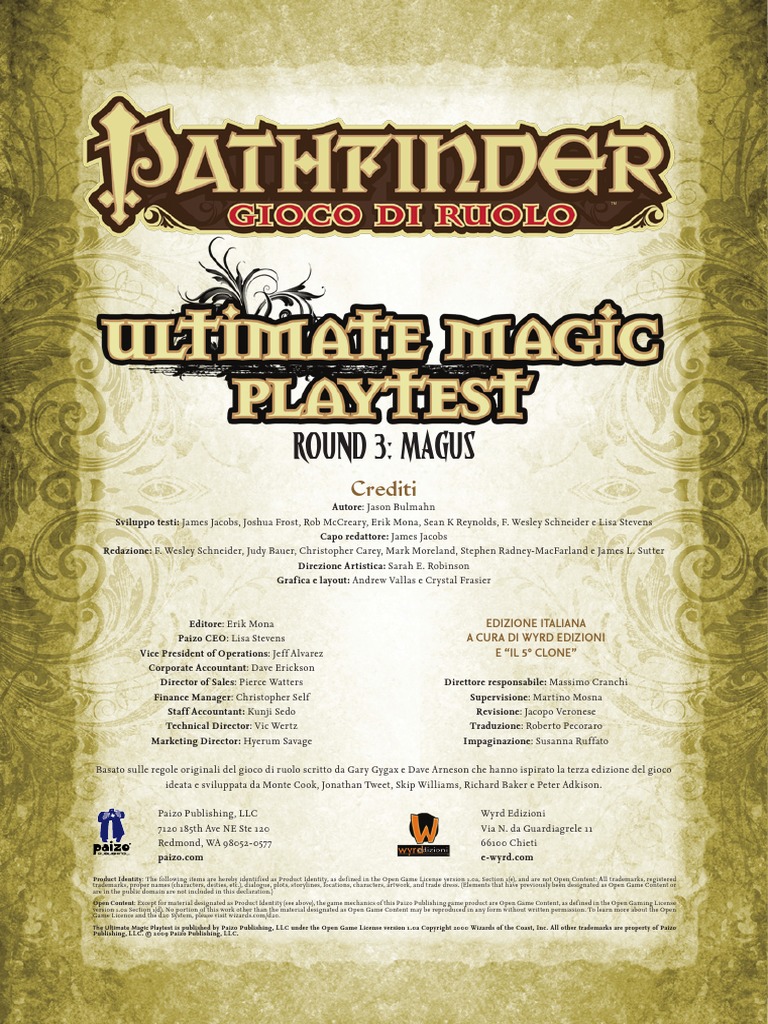The Ultimate Magic Playtest is published by Paizo Publishing, LLC under the Open Game License version 1.0a Copyright 2000 Wizards of the Coast, Inc. All other trademarks are property of Paizo