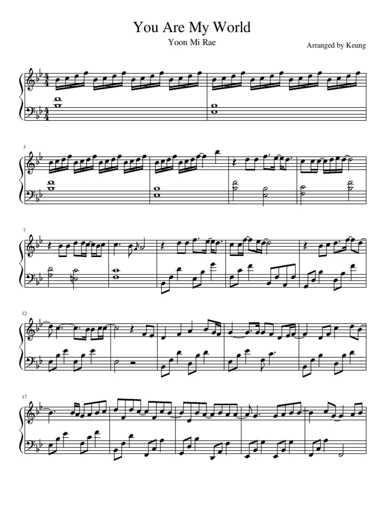 Il documento contiene la notazione musicale per la canzone 'You Are My World' di Yoon Mi Rae arrangiata da Keung.