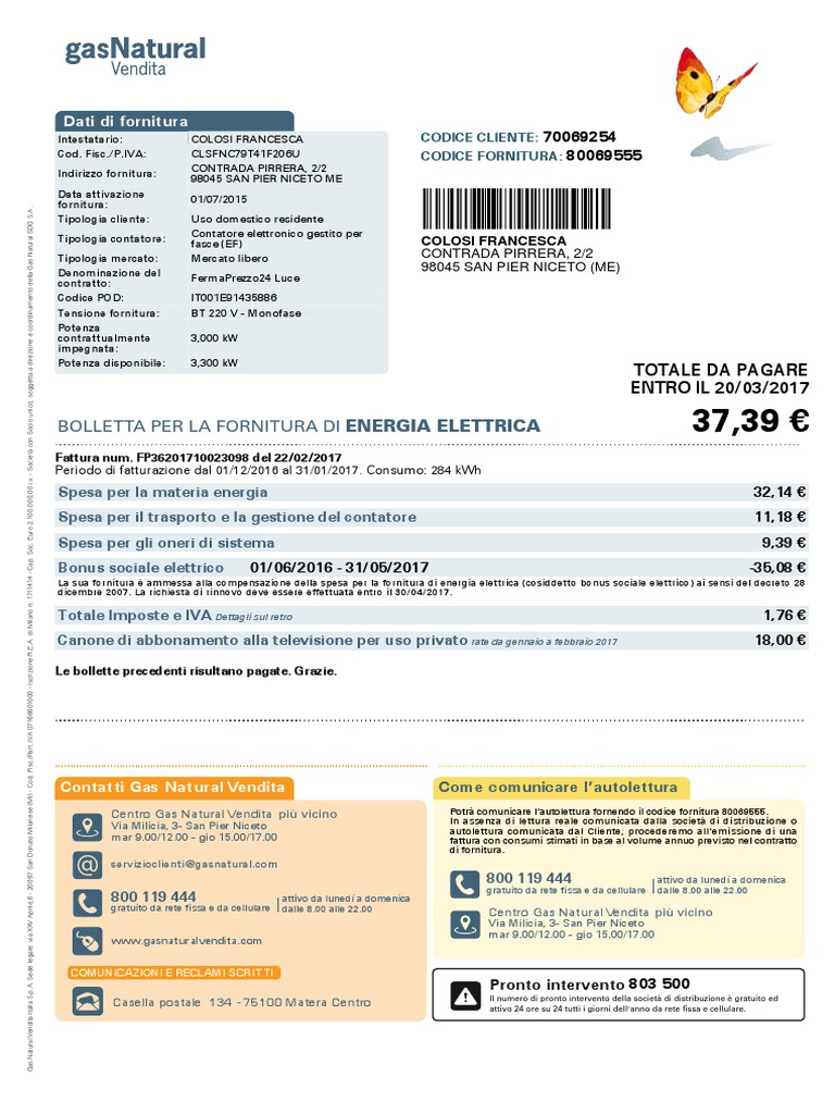 Dettaglio Bolletta N. FP36201710023098 del 22/02/2017
