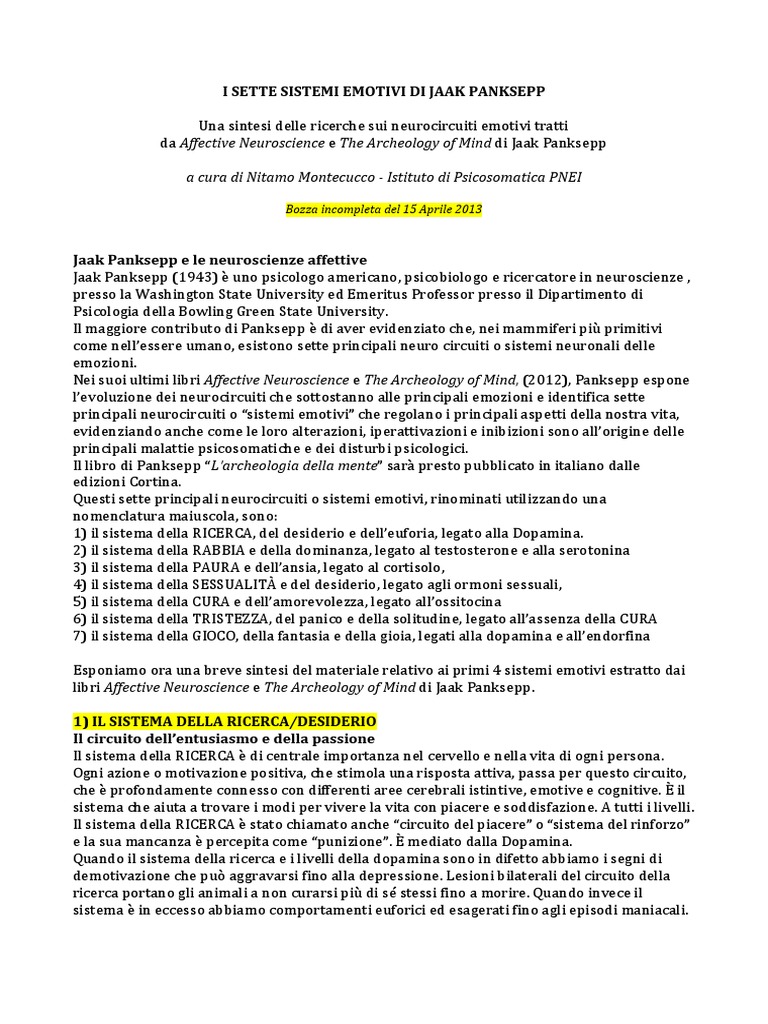 Esponiamo ora una breve sintesi del materiale relativo ai primi 4 sistemi emotivi estratto dai