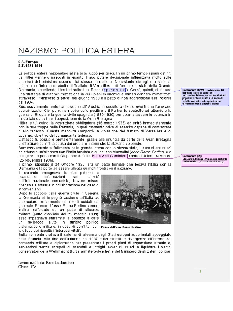 stringere un patto con il Giappone definito Patto Anti-Comintern contro l'Unione Sovietica Commento [2]: