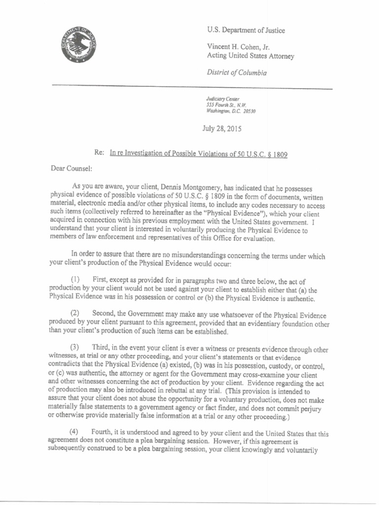 As you are aware, your client, Dennis Montgomery, has indicated that he possesses