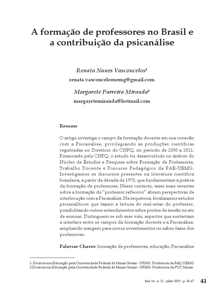 O presente artigo compõe parte de uma pesquisa em andamento intitulada Formação de professores e Psicanálise, desenvolvida no âmbito do Núcleo de Estudos e Pesquisa sobre Formação de Professores, Trabalho Docente e Discurso Pedagógico, da Universidade do Estado de Minas Gerais 3 . Tal pesquisa tem por objetivo investigar as conexões possíveis desenvolvidas entre esses dois campos no Brasil – Educação e Psicanálise –, entre 2000 e 2011, tendo como base os grupos de pesquisa registrados no Diretório do CNPq e suas produções durante esse período.