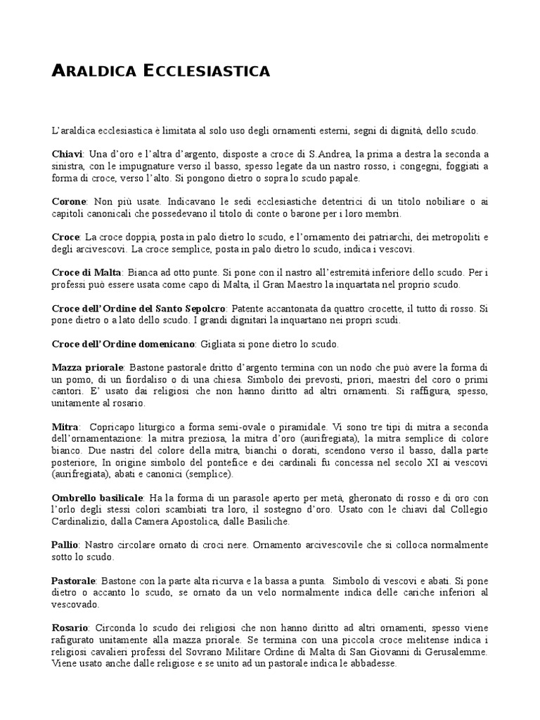 Laraldica ecclesiastica limitata al solo uso degli ornamenti esterni, segni di dignit, dello scudo.