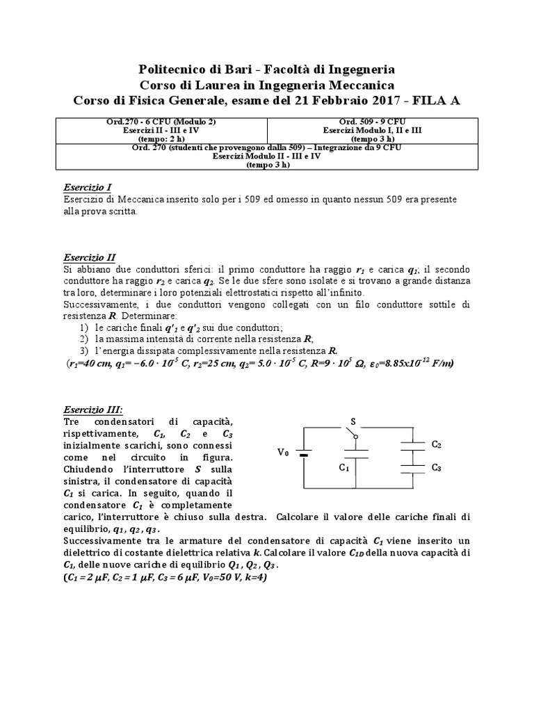 Corso di Fisica Generale, esame del 21 Febbraio 2017 - FILA A