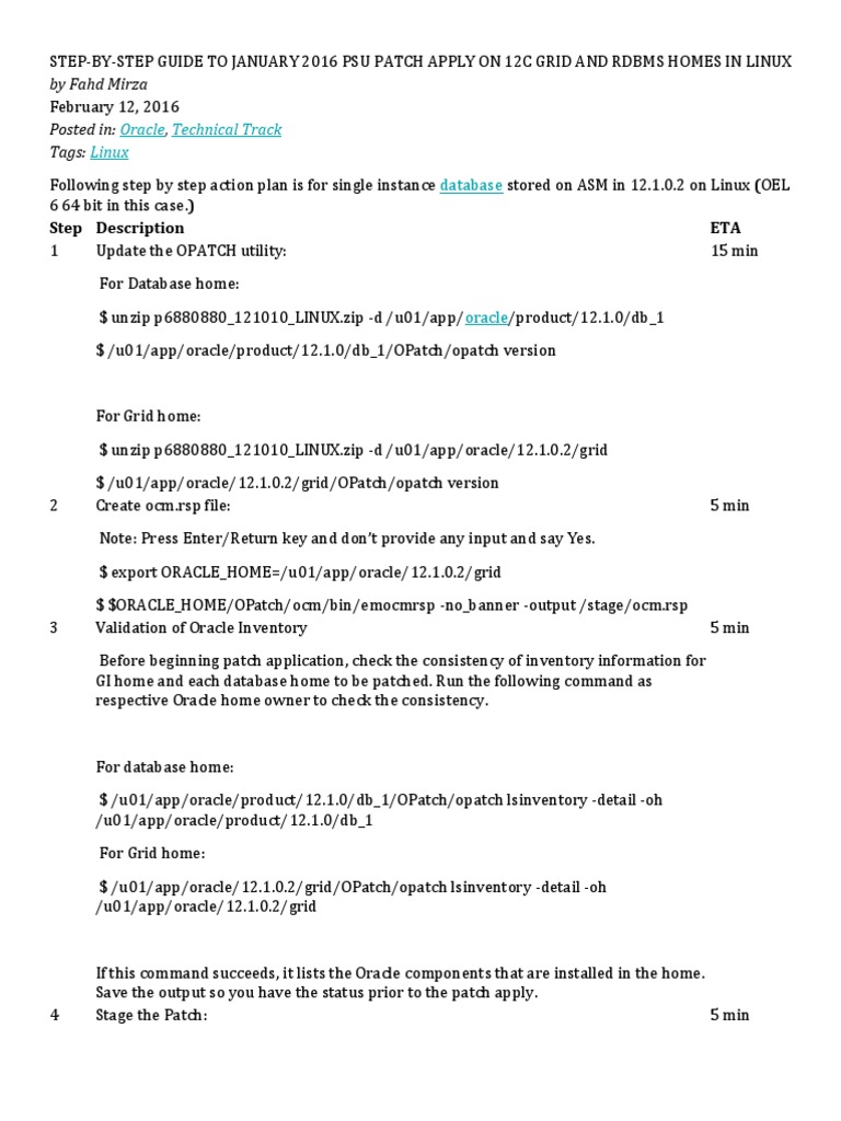 Following step by step action plan is for single instance database stored on ASM in 12.1.0.2 on Linux (OEL