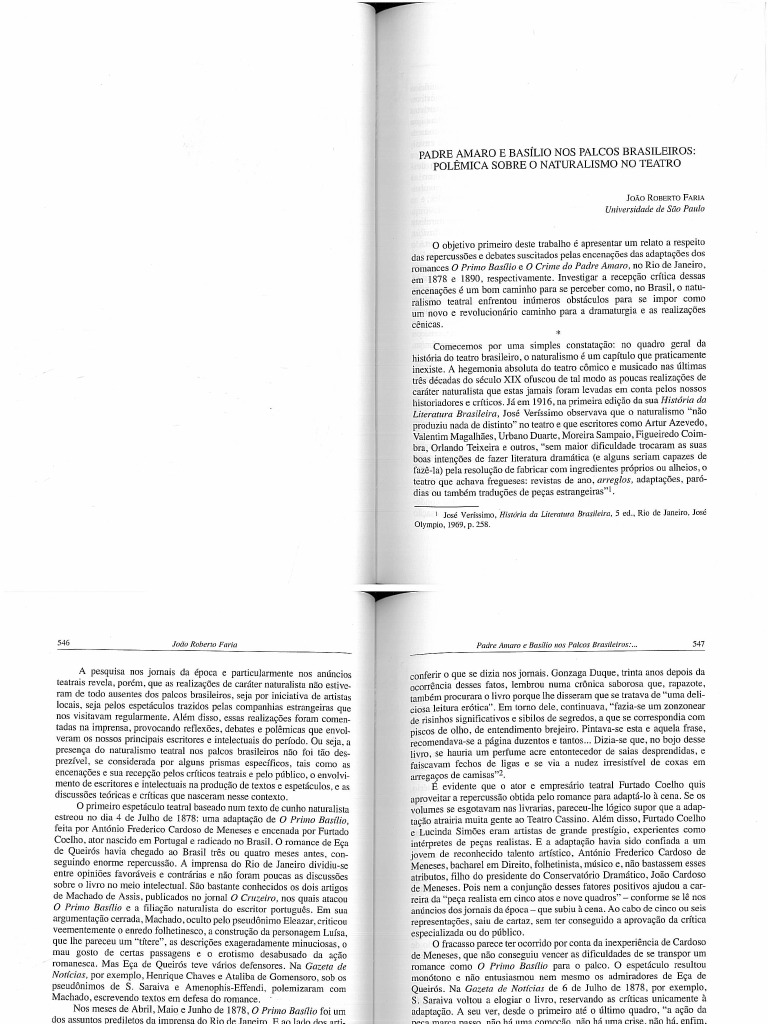 O objetivo primeiro deste trabalho é apresentar um relato a respeito das repercussões e debates suscitados pelas encenações das adaptações dos romances O Primo Basílio e O Crime do Padre Amaro, no Rio de Janeiro, em 1878 e 1890, respetivamente.