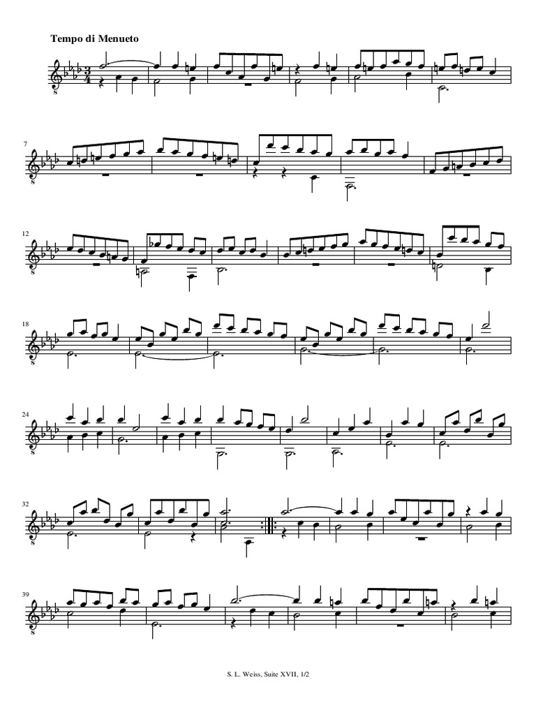 Il documento contiene la notazione musicale di un pezzo per Menuetto in tre frasi di 3/4. Le note sono rappresentate con simboli e la struttura ritmica è ripetuta per varie battute.