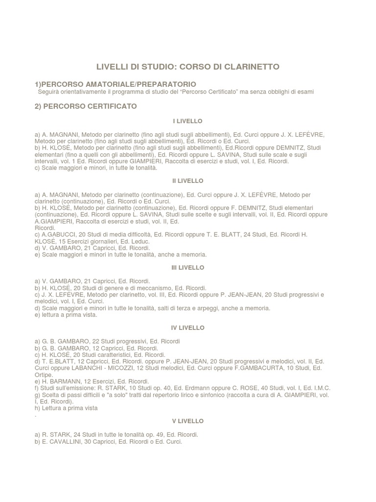 LIVELLI DI STUDIO: CORSO DI CLARINETTO