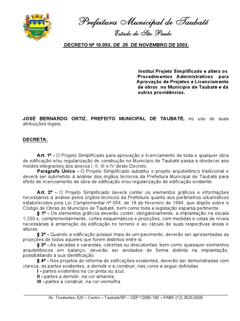 Art. 1º - O Projeto Simplificado para aprovação e licenciamento de toda e qualquer obra de edificação e/ou regularização de construção no Município de Taubaté passa a obedecer aos moldes integrantes dos anexos I, II, III e IV deste Decreto. Parágrafo Único - O Projeto Simplificado substitui o projeto arquitetônico tradicional e deverá ser submetido à análise dos órgãos técnicos da Prefeitura Municipal de Taubaté para efeito de licenciamento de obra de edificação e/ou regularização de edificação existente.