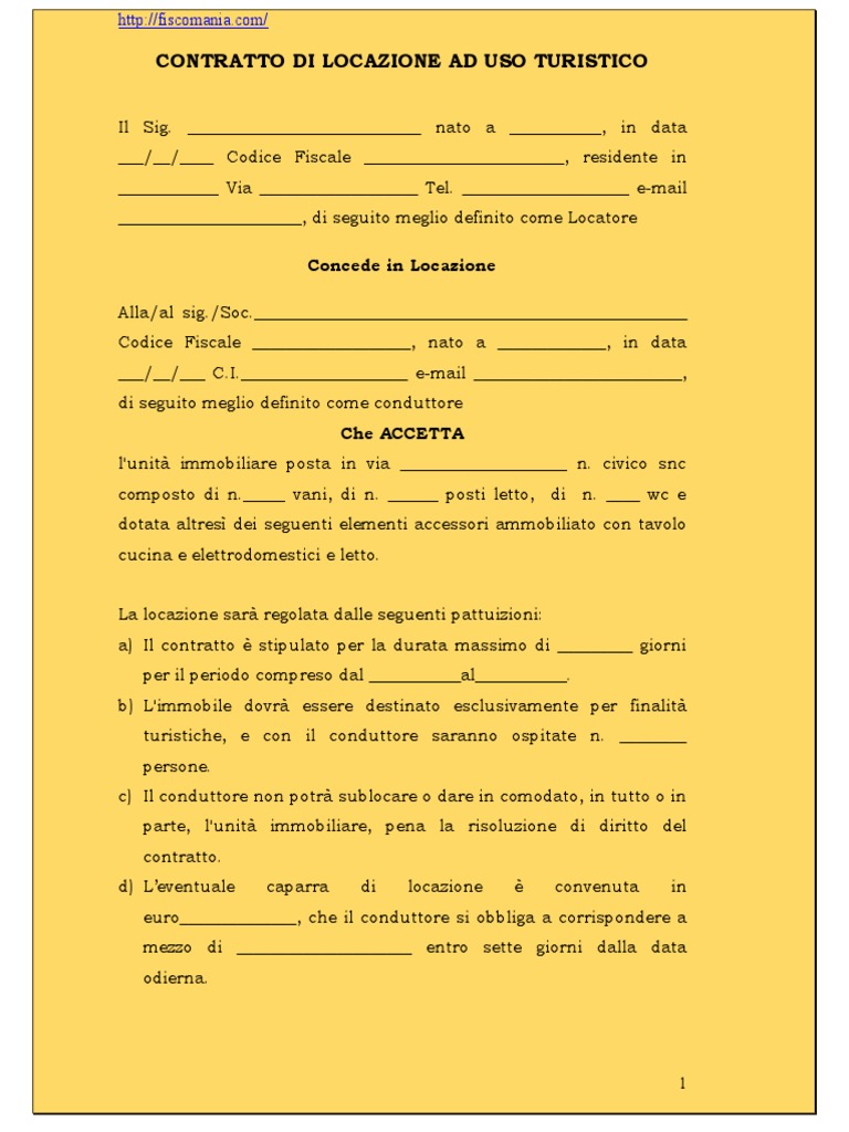 CONTRATTO DI LOCAZIONE AD USO TURISTICO