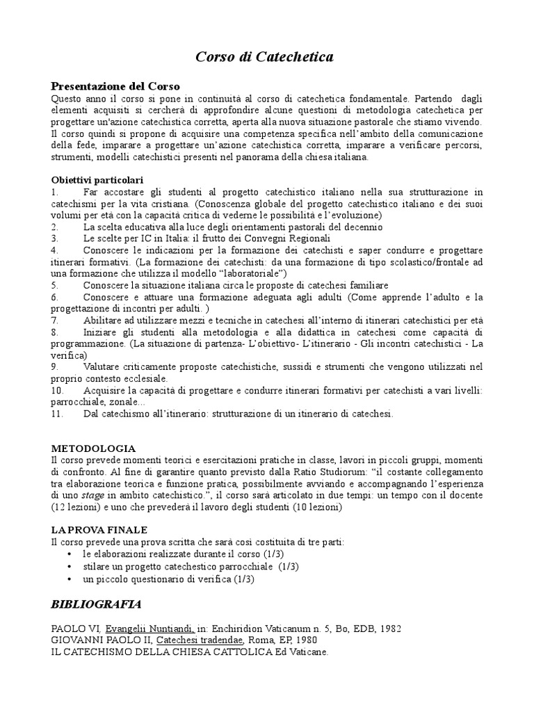 di uno stage in ambito catechistico., il corso sar articolato in due tempi: un tempo con il docente