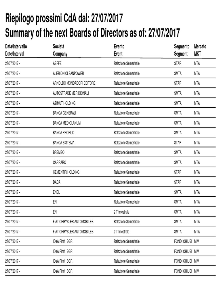 Riepilogo prossimi CdA dal: 27/07/2017