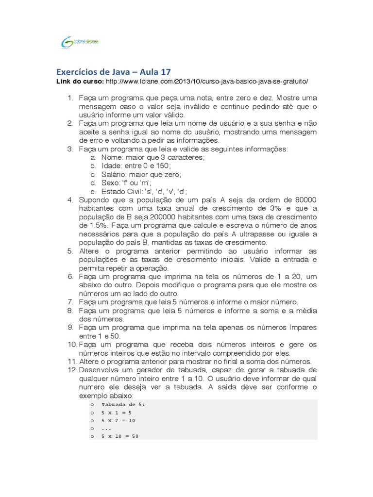 Link do curso: http://www.loiane.com/2013/10/curso-java-basico-java-se-gratuito/