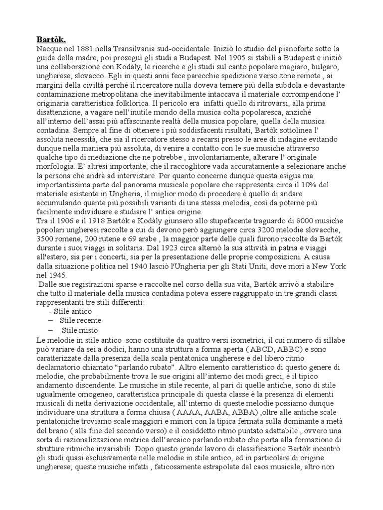 Lo studio della musica popolare rappresentava dunque per Bela Bartk , al pari della
