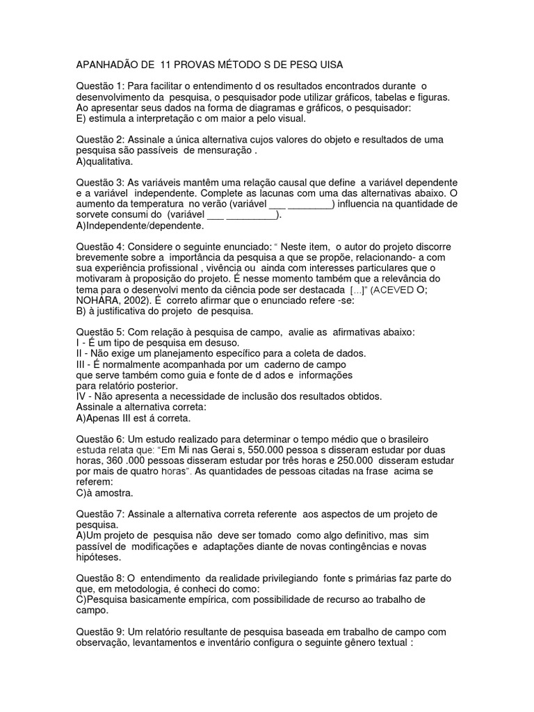 APANHADO DE 11 PROVAS MTODO S DE PESQ UISA