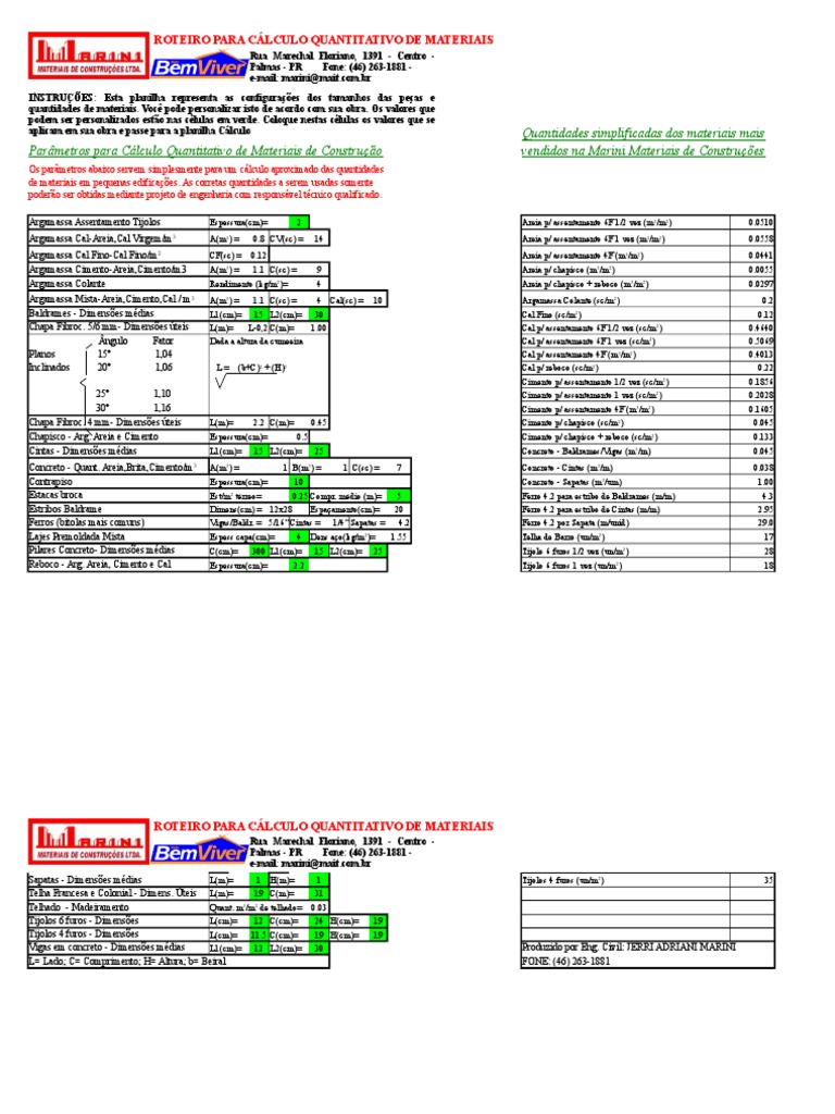 Os cálculos aqui realizados servem simplesmente para um cálculo aproximado das quantidades de