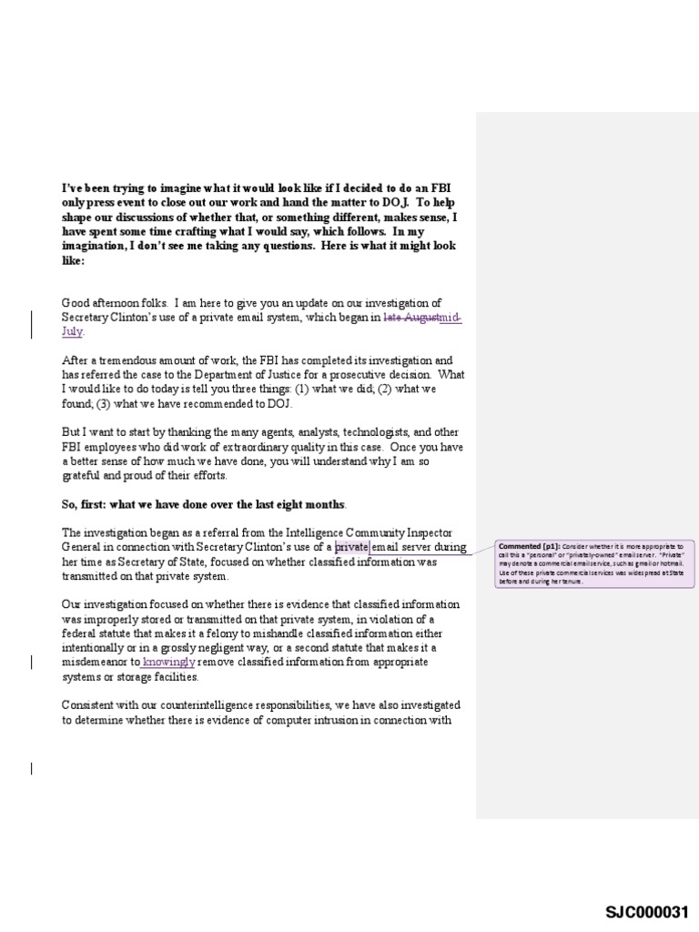 I’ve been trying to imagine what it would look like if I decided to do an FBI only press event to close out our work and hand the matter to DOJ. To help shape our discussions of whether that, or something different, makes sense, I have spent some time crafting what I would say, which follows. In my imagination, I don’t see me taking any questions. Here is what it might look like: