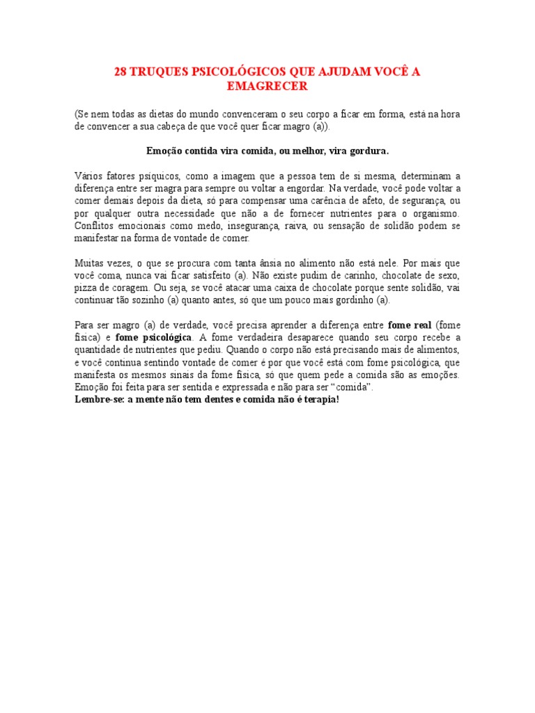 física) e fome psicológica. A fome verdadeira desaparece quando seu corpo recebe a