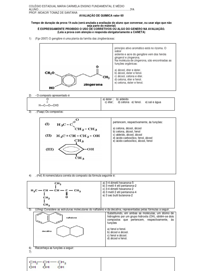 11) Na solução contida num frasco com picles, entre outras substâncias, encontra-se o ácido acético (e). Dê o nome