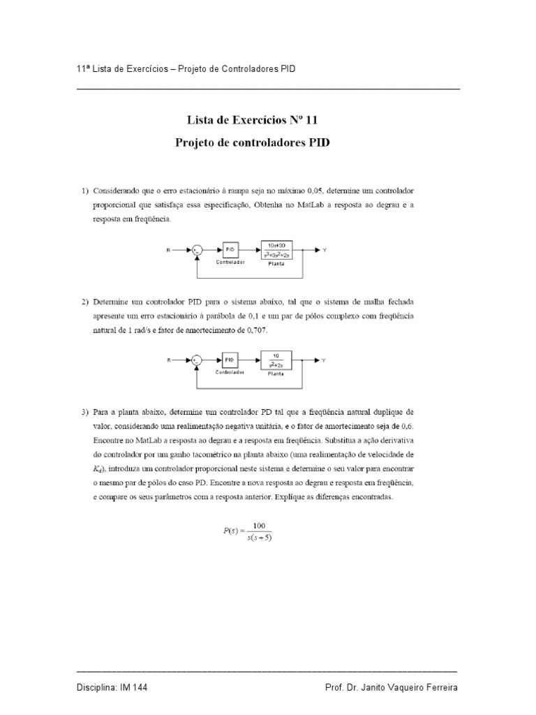 11ª Lista de Exercícios – Projeto de Controladores PID
