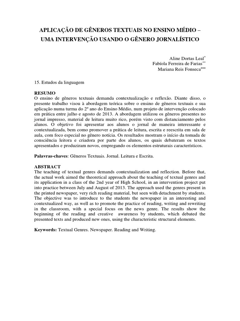 APLICAÇÃO DE GÊNEROS TEXTUAIS NO ENSINO MÉDIO –