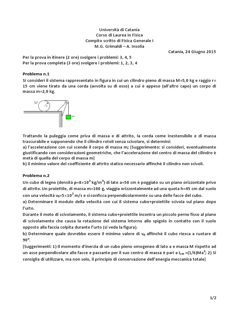 Per la prova in itinere (2 ore) svolgere i problemi: 3, 4, 5