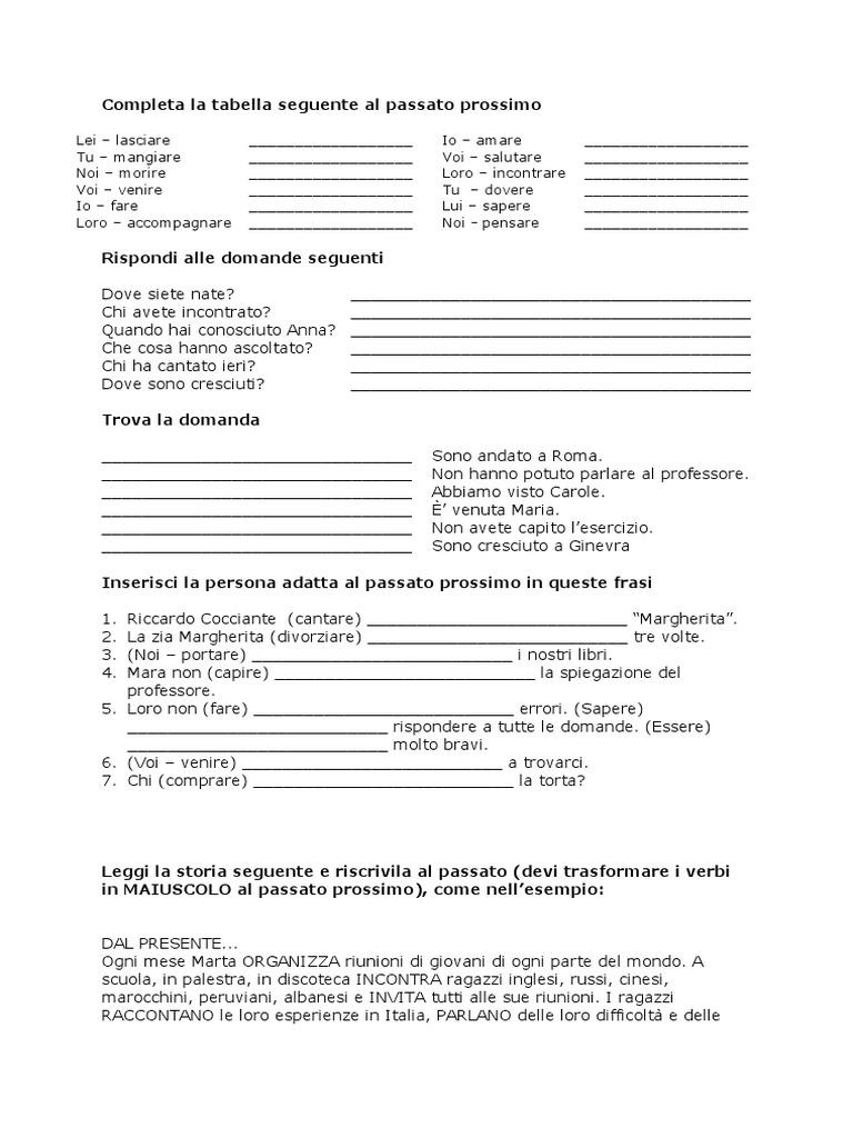 Completa la tabella seguente al passato prossimo